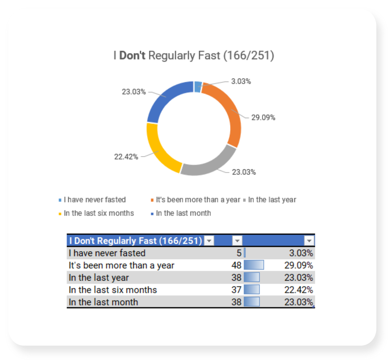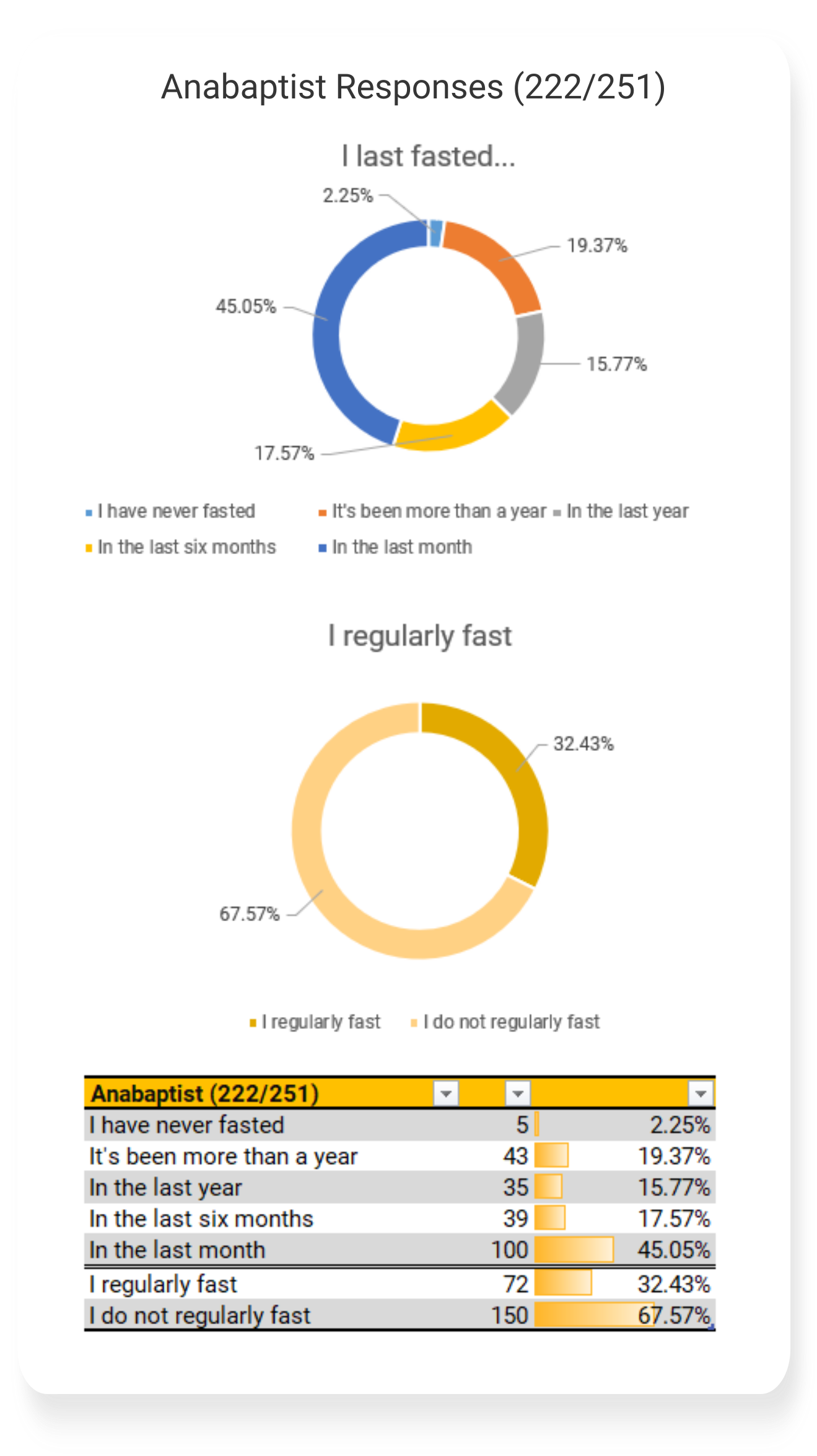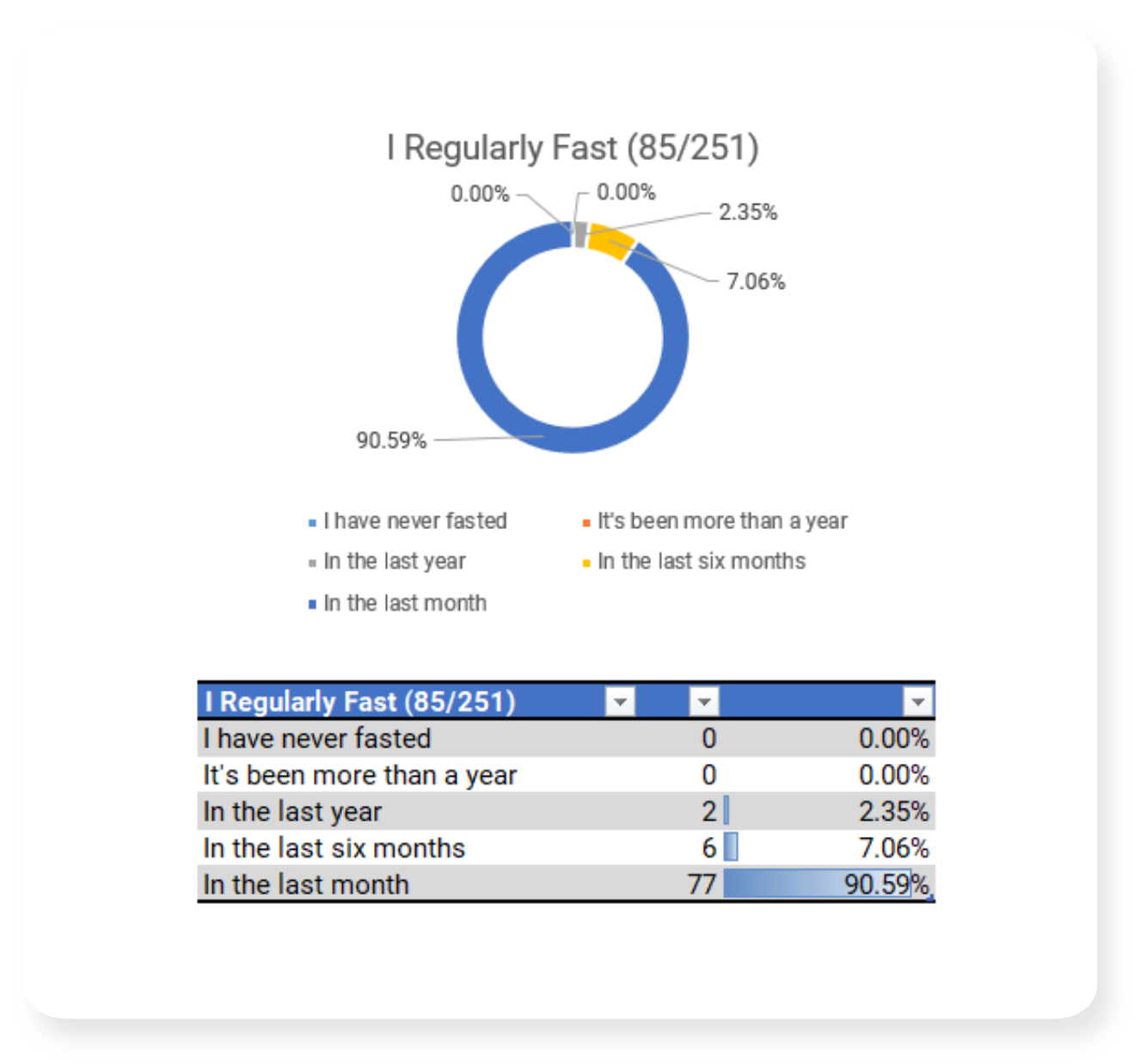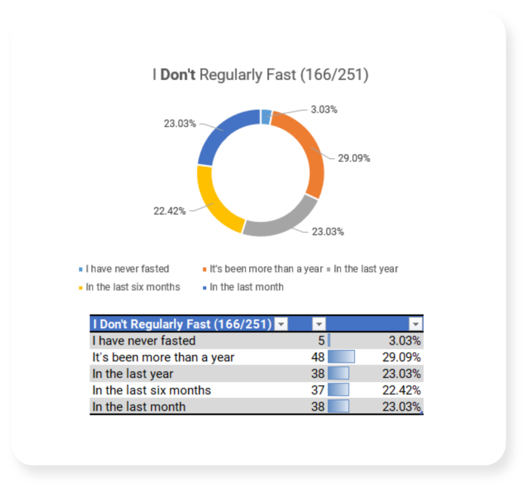 In March of 2026 I shared a survey link asking about fasting practices. This page contains the results.